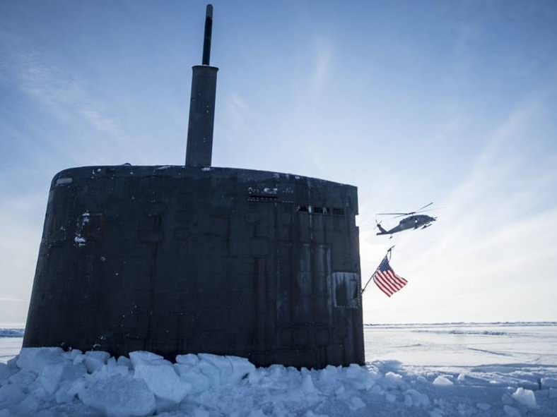 美軍攻擊核潛艇從北極冰面下鉆出 展示美國國旗